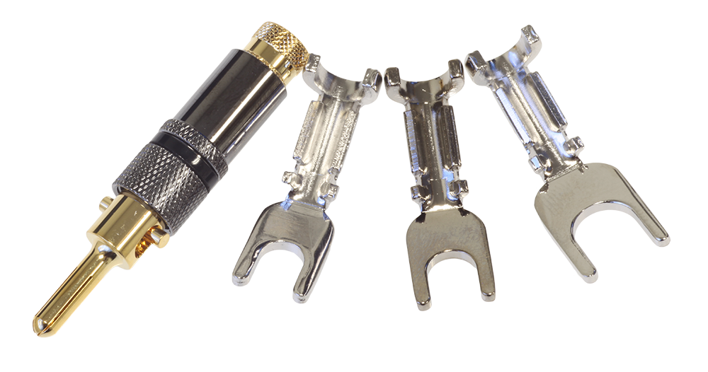 Our standard connectors are our gold-plated locking banana plugs and Rhodium-plated copper spade lugs (available in 6.2, 7.0 or 9.2mm size). All of these connectors are welded to the cable using our unique ultrasonic welding process -- no solder, no intermediary metal -- just a straight strong weld between wire and connector. If you need spade lugs but don't know what size, let us know and we'll send you our binding-post measuring card which will allow you to check before ordering. And, if you need something else in the way of connectors -- Speakons, nonstandard forks or spades, or the like -- just give us a call.