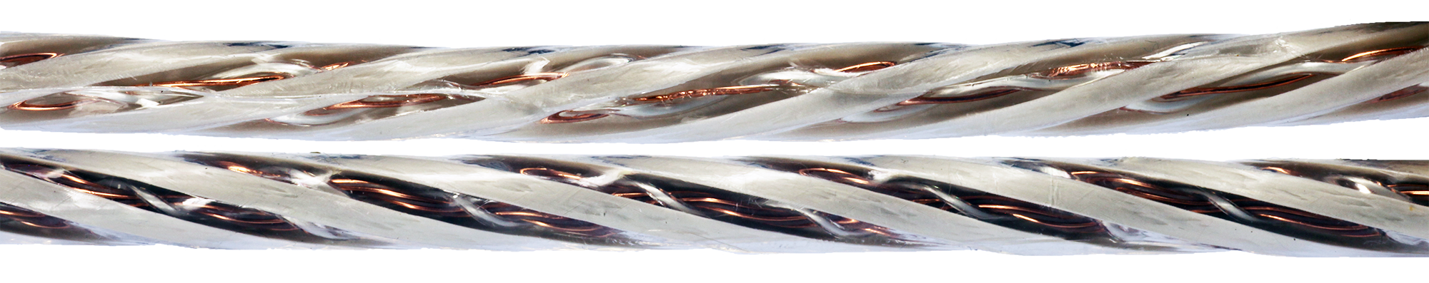 Air is the best dielectric, but a conductor left in an air tube with no spacing separator will tend to press itself against the solid dielectric. To avoid this we use a unique round separator thread. If this were made purely in soft dielectric material, it would not be able to retain a rounded profile -- and hence minimal contact with the wire -- well through the cable; we have solved this problem by using a glass thread as the separator core, with PTFE extruded over it: a perfect combination of strength and dielectric quality.